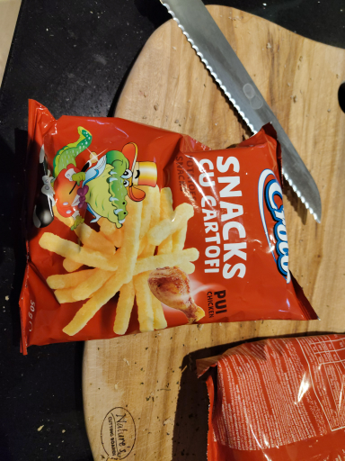 Croco Snacks cu cartofi (Pui) is a chicken-flavoured, potato-based extruded snack sold in small (≈50 g) retail packs. The product is manufactured in Romania by SC CROCO SRL, a Onești-based snack and bakery manufacturer that owns the Croco brand. Croco began as a Romanian brand in the 1990s and produces a range of savory baked goods and snacks; the Snacks cu cartofi line is listed among its product portfolio and is labelled as produced in Romania. Ownership and distribution are handled by SC CROCO SRL (the original company), which remains the brand owner and principal manufacturer. The packaging shows Croco brand artwork and Romanian-language labeling (e.g., "SNACKS CU CARTOFI" and "PUI"), consistent with products produced primarily for the Romanian market and exported regionally.