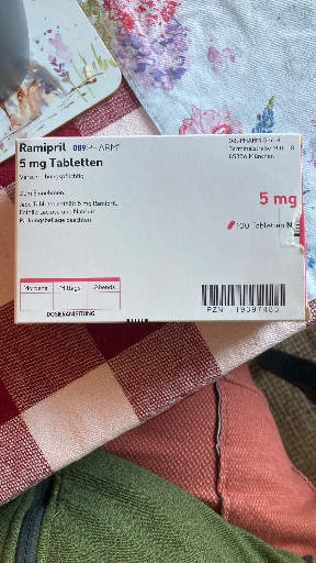 (Hinweis: Identifikation basiert auf sichtbarer Beschriftung "Ramipril 5 mg Tabletten" und typischen deutschen Generikapackungen; für eine exakte Hersteller‑/PZN‑Zuordnung wäre eine lesbare PZN/Herstellerzeile oder ein hochauflösend lesbarer Barcode hilfreich.)