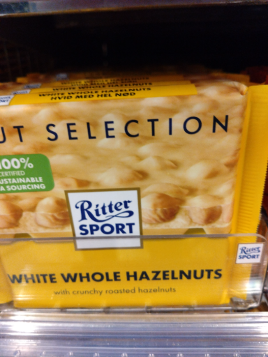 The photographed item is the Ritter Sport "White Whole Hazelnuts" 100 g chocolate bar — a white chocolate square bar with whole roasted hazelnuts (and rice crisps in this recipe) from Ritter Sport's Nut Selection. (ritter-sport.com)