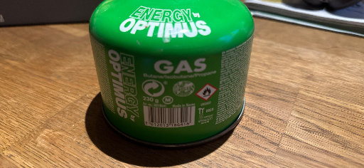 Das abgebildete Produkt ist ein Optimus Gas-Butan/Propan/Isobutan-Kartusche (230 g) aus der "Energy by Optimus"-Linie, gedacht als Brennstoff für tragbare Camping-/Expeditionskocher. Die handelsübliche Zusammensetzung (n-Butan, Isobutan, Propan) und Gewichtsangabe 230 g stimmen mit den Produktdaten überein. (roswi.com)