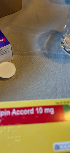 Amlodipin Accord 10 mg er en receptpligtig tablet med virkestoffet amlodipin (en calciumkanalblokker) anvendt til behandling af hypertension og forebyggelse af angina. Identifikationen følger produktnavnet og tabletbeskrivelsen fra europæiske lægemiddeldatabaser og lokale indlægssedler for Amlodipin "Accord". (min.medicin.dk)
