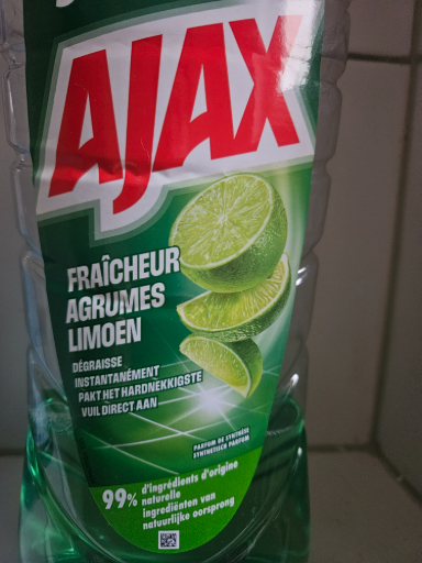 Ajax is a long-established household cleaning brand originally launched in the United States by Colgate-Palmolive in 1947. The pictured product is a lime-scented Ajax dishwashing liquid marketed in Francophone and Dutch-language markets (label text: "Fraîcheur Agrumes / Limoen"), indicating packaging for Benelux/Belgium/Netherlands or nearby EU markets.