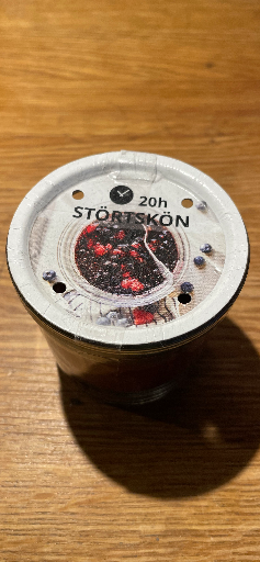 Den uppladdade bilden visar ett STÖRTSKÖN-doftljus från IKEA — glasbehållare med bärdoft och angiven brinntid 20 timmar, vilket matchar IKEAs produktbeskrivning för STÖRTSKÖN doftljus i glas (Bär/röd, 20 tim). (ikea.com)