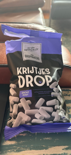 Dropmakers Krijtjes Drop is a Dutch-style licorice confectionery (zoete drop) sold in a purple/black bag under the Dropmakers private‑label. The package text and retail listings identify the product as “Krijtjes Drop” (chalk-shaped, filled drop sweets) sold under the Dropmakers name. (worldwideholland.com)