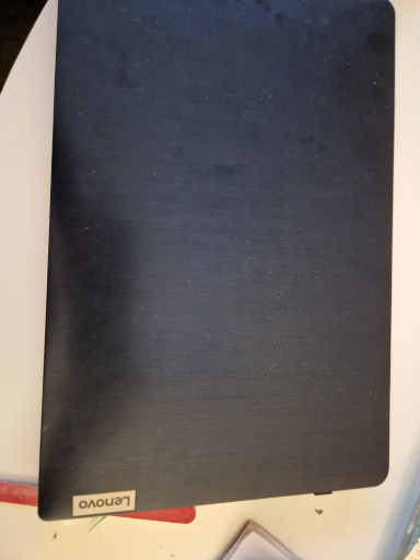 The photo shows the closed lid of a Lenovo laptop — the small rectangular "Lenovo" badge in the lower-left corner and the black textured finish are consistent with Lenovo consumer and business notebooks (IdeaPad, Yoga, ThinkBook/ThinkPad-family variants use similar corner branding). The image does not show model-specific markings, ports or keyboard details, so an exact model number cannot be determined from this view.