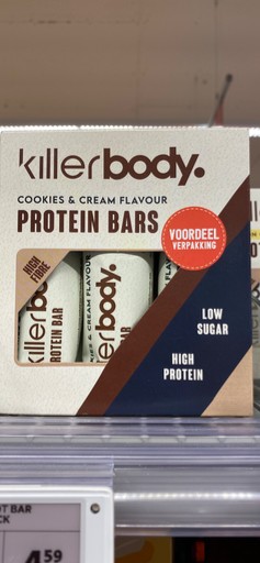 Killerbody Protein Bars – Cookies & Cream are a protein snack bar produced under the Killerbody brand. The product is positioned as a low-sugar, high-protein convenience snack (40 g bars, often sold in multi‑packs or "voordeelverpakking") and is marketed primarily in the Netherlands through supermarkets and online retailers.