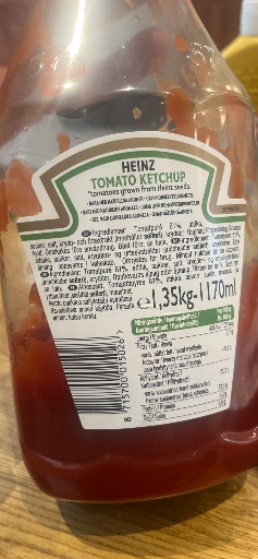 Streckkoden som ofta används för denna storleksvariant (av europeisk distribution) matchar EAN 8715700015026 i offentliga produktlistningar för Heinz Tomato Ketchup 1.35 kg; EAN-prefixet 871 indikerar registrering kopplad till Nederländerna/regionen, vilket stämmer med europeisk produktion och distribution. (21food.com)