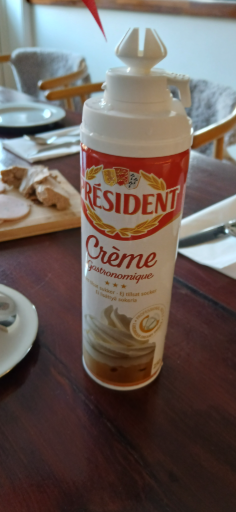 Président Crème gastronomique in an aerosol (spray) format is a dairy whipped-cream product sold under the Président brand. Président is a long-established French dairy brand created by the Besnier family (Société Laitière Besnier) and launched in the late 1960s.