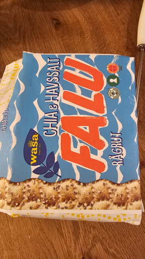 Pakken viser Wasa Falu Rågrut Chia & Havssalt — et knækbrød (rye crispbread) toppet med chiafrø og havsalt. Dette er en navngiven variant i Wasa-sortimentet og markedsføres præcist som "Falu Rågrut Chia & Havssalt". (wasa.com)