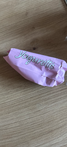 The photographed product is Yogurette — a pink-wrapped, individually packaged filled chocolate bar with a strawberry–yogurt cream center that is sold by Ferrero. (brands-of-germany.com)