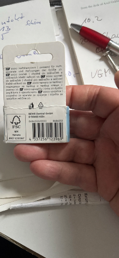 Vivess is REWE's in‑store private label used for low‑cost household, stationery and basic office items. Staples sold under such private labels are typically manufactured in Asian manufacturing hubs (primarily China) with some production/shipments also originating from Thailand or South Korea depending on supplier and lot — hence "Primarily in China, but also produced in other locations." Packaging also carries an EAN barcode (transcribed from the image as 4337256129369) and the FSC/MIX certification mark for the cardboard sleeve.