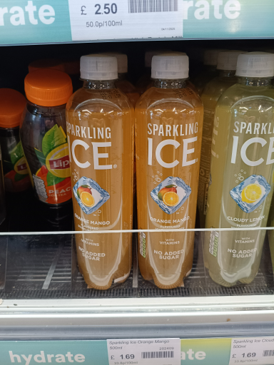 The photographed product is Sparkling Ice (flavour: Orange Mango) — a tall slim PET bottle of Sparkling Ice flavoured sparkling water. The label styling and bottle shape match Sparkling Ice’s standard retail SKU: a zero‑sugar, vitamin‑enriched flavoured sparkling water available in multiple flavours (here: Orange Mango).