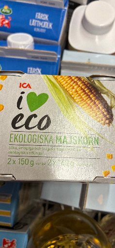 ICA I love eco – Ekologiska majskorn is a private‑label organic corn product sold under ICA’s "I love eco" range. The photographed pack is the common 2 × 150 g format marketed in ICA stores in Sweden. The I love eco range is ICA Gruppen’s organic/private‑label offering, positioned to provide certified organic alternatives across many grocery categories.