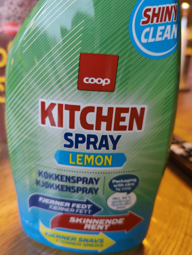 Billedevisningen viser en Coop‑mærket køkkenrengøringsspray i citrus/"Lemon" duft — et Coop private‑label køkkensprayprodukt (mærket "coop" i rød firkant på etiketten) solgt på de nordiske markeder. (svanemaerket.dk)