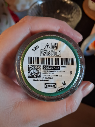 The photographed product is labelled "Made in Poland" and IKEA sources for many of its glass and candle products in Poland; IKEA candle lines (including similar glass jar candles) are commonly produced in Poland. The label on the item confirms Poland as the country of manufacture. (islas.ikea.es)