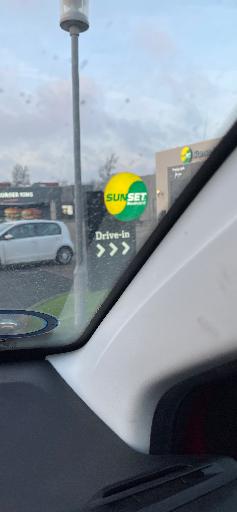 Sunset Boulevard is a Danish fast-food restaurant chain (commonly branded simply as “Sunset”) known for burgers, sandwiches and fries; the photographed drive-in signage matches the chain’s logo and on-site branding. The concept was founded in Odense in 1996 and is operated through the corporate organisation behind Sunset Boulevard, with restaurants primarily located across Denmark and select locations in the Faroe Islands, Greenland and Germany. (en.wikipedia.org)