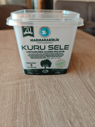 Marmarabirlik Kuru Sele is a packaged table olive product (labelled in Turkish as "Kurutulmuş Doğal Salamura Siyah Zeytin"), sold under the Marmarabirlik brand and presented as dried / brine‑cured black olives in a plastic tub. (marmarabirlik.com.tr)