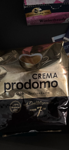 The photographed package matches Dallmayr's "Crema prodomo" coffee — the Prodomo product family in a gold/black pack labelled "CREMA prodomo," marketed as a 100% Arabica Crema blend recommended for fully automatic machines. (dallmayr.com)