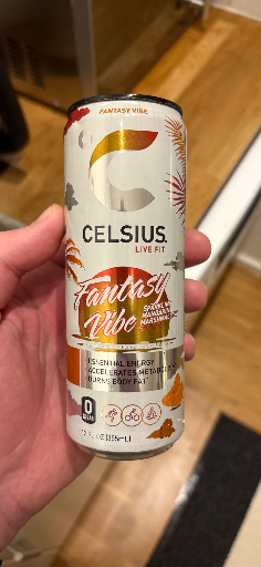Celsius Live Fit — Fantasy Vibe is a slim 12 fl oz sparkling functional energy drink from the CELSIUS® Live Fit line. The "Fantasy Vibe" flavor is described by the brand as a mandarin‑marshmallow (orange‑cream) profile — a bright citrus front with a creamy, marshmallow‑like finish. The product is positioned as an "essential energy" beverage: zero sugar, vitamin‑fortified, containing caffeine (the slim can variants deliver ~200 mg per 12 fl oz) and the company's MetaPlus blend.