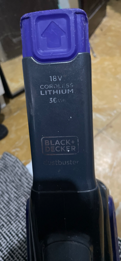 The photographed unit is a BLACK+DECKER Dustbuster-series handheld vacuum battery/handle — a cordless, lithium-ion powered hand vacuum (the Dustbuster line). The Dustbuster name refers to Black+Decker’s long-running family of portable hand vacuums first introduced in January 1979.
