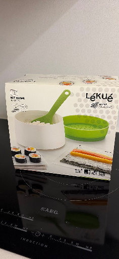 Lékué es la marca que aparece en la caja de la imagen; el producto visible es un kit para preparar maki/sushi (makisu de silicona, cuenco para arroz y espátula) — es un accesorio de cocina para elaborar y enrollar maki de forma higiénica y antiadherente. (lekue.com)