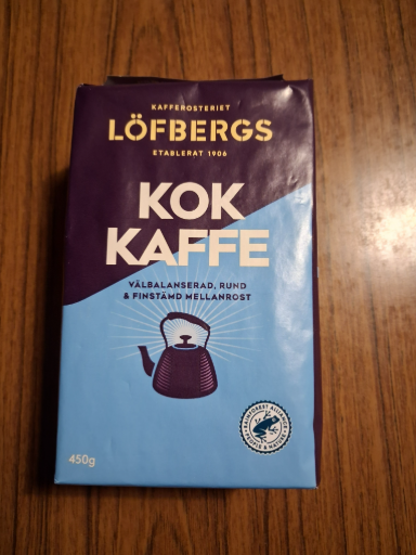The photo shows Löfbergs Kokkaffe (labeled "KOK KAFFE") in the brand's purple/blue packaging — a 450 g package of ground coffee formulated as "kokkaffe" (coarser grind intended for stovetop/boiled preparation). (lofbergs.se)