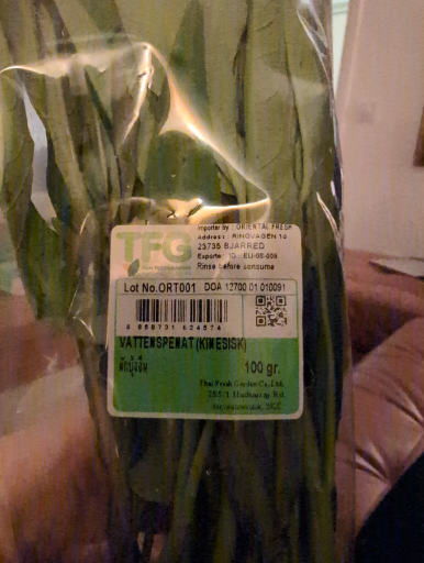 The photographed item is labelled with a TFC logo and the Swedish-language product name "VATTENSPENAT (KINESISK)" with a 100 g declaration — this identifies the product as packaged water spinach (Chinese water spinach / morning glory) sold in a 100 g pack. (share.ohgarden.se)