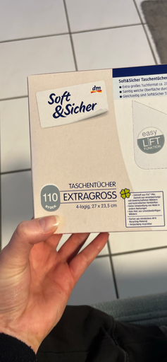 Soft&Sicher is a private-label tissue brand from the German drugstore chain dm (dm-drogerie markt). The pictured product is a Soft&Sicher tissue box — 4-ply, extra-large facial tissues (Taschentücher), 110 sheets per box, sold under dm’s own Soft&Sicher range.