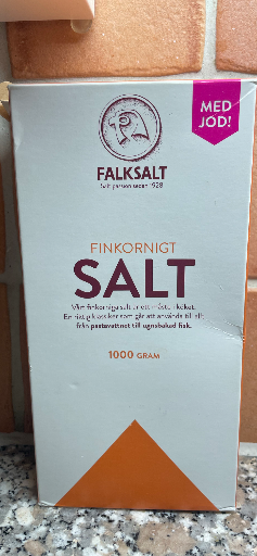 Falksalt is a long-established Swedish table-salt brand first introduced in 1928 and today sold under the Falksalt family of products. The specific product shown is Falksalt Finkornigt Salt (med jod), a fine-grain iodized table salt sold in 1000 g packaging. (falksalt.com)