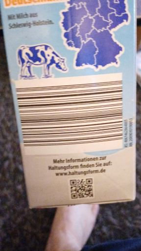 Die abgebildete Verpackung ist ein Milchkarton (Frischmilch) mit dem deutschen Haltungsform-Verweis und einer Deutschlandkarte, die auf Schleswig‑Holstein als Herkunftsregion hinweist. Die Kennzeichnung "Mehr Informationen zur Haltungsform finden Sie auf: www.haltungsform.de" ist auf der Packung sichtbar und verweist auf das offizielle Haltungsform‑Informationsportal, das die fünfstufige Kennzeichnung für Tierhaltungsbedingungen auf Fleisch- und Milchprodukten erklärt. (haltungsform.de)