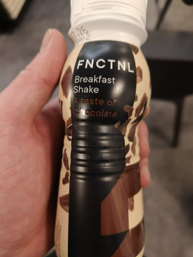 The pictured product is sold as the FNCTNL Breakfast Shake with the flavor label "A taste of Chocolate" and is categorized as a ready-to-drink protein/meal-replacement style breakfast shake. Evidence for this exact product listing appears in European food product databases and nutrition-tracking sites that list "Breakfast Shake / Protein shake — a taste of chocolate" under the FNCTNL brand. (foodrepo.org)