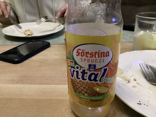 Förstina Sprudel Vital tropic is a fruit/vegetable soft drink marketed as an Ananas‑Orange‑Karotte (pineapple‑orange‑carrot) beverage. The label describes it as an "Ananas‑Orange‑Karotte‑Getränk" with roughly 10% fruit and 2% vegetable content and added vitamins, sugar and sweeteners. It is sold in PET bottles in the German retail market.