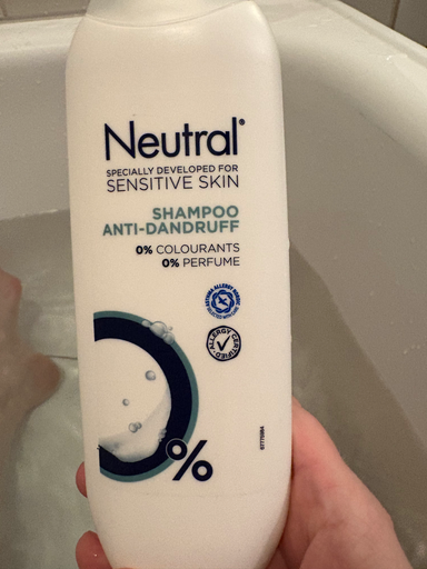 Flasken er Neutral Shampoo, specifikt Anti-Dandruff / Anti-skæl-varianten – en parfume- og farvestof-fri shampoo udviklet til sensitiv hud og hovedbund. Dette fremgår tydeligt af mærkningen "Neutral", "SPECIALLY DEVELOPED FOR SENSITIVE SKIN", "SHAMPOO ANTI-DANDRUFF" og "0% COLOURANTS / 0% PERFUME" på emballagen. (neutral.dk)
