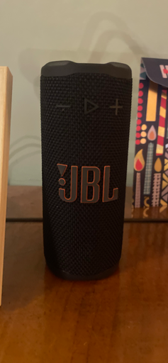 The photographed item is a JBL Flip-series portable Bluetooth speaker (Flip-style cylindrical, fabric-wrapped design with tactile volume and playback controls). The visible control icons (minus, play/triangle, plus) and the large JBL logo on the fabric grille match JBL’s Flip family design language (commonly seen on Flip 5 / Flip 6 models).