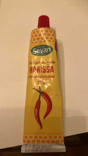 Kortfattat: det här är Sevan Harissa 70 g, en chili-/harissapasta i tub som säljs i nordiska butiker och produceras av Sevan i Sverige (produktion samlad i Rosersberg). Sevan är en svensk, familjeägd matkoncern som äger varumärket och driftar produktionsanläggningen där många av deras såser och hummus-produkter tillverkas. (sevan.fi)
