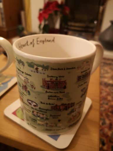 The photographed item is a Denby "Heart of England" mug from Denby Pottery’s Regions & Counties series — a ceramic souvenir/map-style mug illustrating places and landmarks. The design and interior rim text (“Heart of England”) match Denby’s county/region series styling.