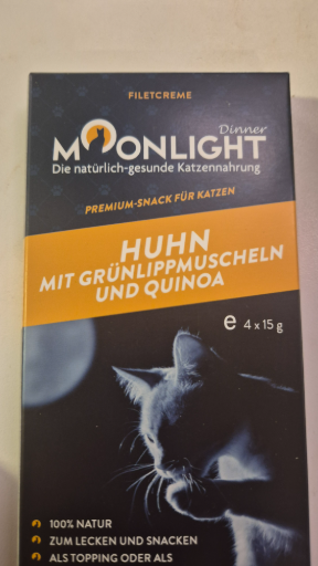 Moonlight Dinner Filetcreme (Huhn mit Grünlippmuscheln & Quinoa, 4x15 g) ist ein deutscher Premium-Katzensnack der Marke Moonlight Dinner, entwickelt und vermarktet von M+W Tiernahrung GmbH – einem familiengeführten deutschen Unternehmen. Herstellung und Hauptvertrieb erfolgen primär in Deutschland, die Marke bleibt im Besitz des deutschen Unternehmens M+W Tiernahrung GmbH. (moonlight-cat.de)