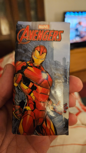 The item in the photo is a licensed Marvel "Avengers" mini milk chocolate bar featuring Iron Man on the wrapper — the same style of individually wrapped mini chocolate bars sold as Marvel/Avengers party or novelty chocolates. (candywarehouse.com)