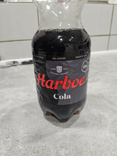 Harboe Cola is the cola soft drink from Danish brewery Harboes Bryggeri A/S. The label in the photo shows the Harboe script and the Danish wording "Nul Sukker" (0% sugar), matching Harboe's sugar‑free cola product line. (harboe.com)