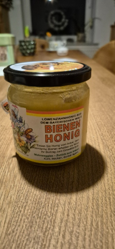 Die Bestimmung basiert auf der sichtbaren Beschriftung ("Bienen Honig", Erwähnung des Bayerischen Waldes und die Sorte Löwenzahnhonig). Weil auf dem Foto kein deutlich lesbarer Produzentname, Herstelleradresse oder Barcode zu sehen ist, lässt sich der exakte Firmenname und damit ein eindeutiger Marken‑/Eigentümernachweis nicht verifizieren. Für eine präzisere Herkunfts‑/Eigentumsbestimmung wäre eine Nahaufnahme des vollständigen Etiketts (Rückseite mit Herstellerangaben und Barcode) erforderlich. (de.wikipedia.org)