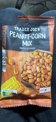 The photographed item is Trader Joe's Peanut‑Corn Mix — labeled on the pack as “Peanut‑Corn Mix (Roasted & Spiced)” and marketed as a spicy savory snack (peanuts combined with crunchy roasted corn). This product appears in food/product databases under that exact name and nutrition profile. (mynetdiary.com)