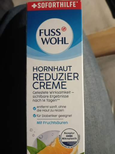 Die abgebildete Tube ist die "FUSSWOHL Hornhaut Reduziercreme" — ein Fußpflegeprodukt (Hornhaut-reduzierende Creme) aus der FUSSWOHL-Produktlinie, die als Eigenmarke bei der Drogeriekette Rossmann geführt wird. (rossmann.de)