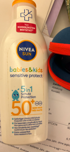 Das Foto zeigt die NIVEA SUN "Babies & Kids Sensitive Protect" Sonnenlotion mit Lichtschutzfaktor 50+ – eine unparfümierte, extra wasserfeste Sonnenschutz-Formulierung, speziell für empfindliche Baby‑ und Kinderhaut. Diese Produktvariante gehört zur NIVEA SUN Reihe und ist als Kinder-/Baby‑Sonnenlotion deklariert. (nivea.de)