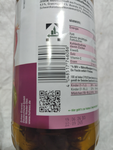 Das Produkt ist "Hohes C Plus Eisen" (1 L Flasche) — ein angereichertes Fruchtsaftgetränk aus der hohes C-Produktlinie. Der auf dem Etikett sichtbare EAN-Barcode 4048517746086 stimmt mit Produktlistings und Datenbanken für Hohes C Plus Eisen überein. (bloaty.io)