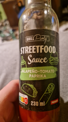 Die abgebildete Flasche ist die "Grill Party Streetfood Sauce" in der Sorte Jalapeño – Tomate – Paprika (Füllmenge auf dem Etikett: 230 ml). Diese Produktbezeichnung und Sorte wird unter dem Grill Party-Label führend auf Produktdatenbanken aufgeführt und entspricht der Flaschenbeschriftung auf dem Foto. (kaloricketabulky.sk)