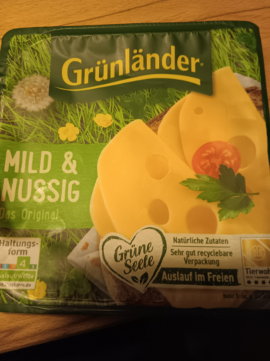 Grünländer is a brand of cheese known for its mild and nutty flavor, originating in Germany. The brand is produced by Bergader Privatkäserei, a family-owned company that has been crafting dairy products for generations. This particular cheese is characterized by its creamy texture and is made from natural ingredients, which appeals to a wide audience. The packaging emphasizes its recyclability and natural ingredients, highlighting the brand's commitment to sustainability and quality.