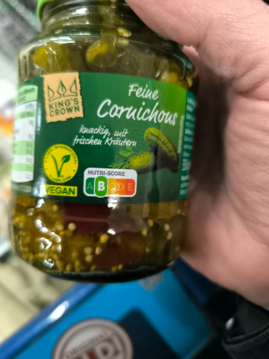 King's Crown is a brand specializing in pickled products and other condiments, originally founded in the Netherlands. The brand is currently owned by Ahold Delhaize, a major player in the grocery retail sector, which operates multiple supermarket chains across Europe and the United States. The product displayed is a jar of cornichons, which are small pickled cucumbers, known for their crunch and often enjoyed in various culinary dishes. The manufacturing process involves sourcing fresh ingredients, and the product is often produced in multiple countries to meet demand.