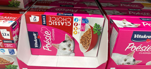 Vitakraft Poésie is a premium wet cat food line from Germany, offering a variety of flavors tailored to adult cats' nutritional needs. The 'Création with Chicken & Garden Vegetables' variant features tender chicken pieces combined with garden vegetables in a savory sauce, all presented in a heart-shaped bowl for an appealing presentation. This product is manufactured in multiple countries to meet global demand. Vitakraft Pet Care GmbH & Co. KG, the company behind the Poésie brand, is headquartered in Germany and is known for its commitment to quality and innovation in pet care products. The brand is not owned by any subsidiary; it remains under the ownership of Vitakraft Pet Care GmbH & Co. KG.