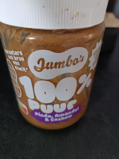 Jumbo's 100% Puur Notenpasta Pinda, Amandel & Cashew is a nut butter product offered by Jumbo, a prominent Dutch supermarket chain. The product is manufactured in the Netherlands, aligning with Jumbo's operations. Jumbo Supermarkten B.V. is the original company behind the brand, which is currently owned by Ahold Delhaize, a major international retail company headquartered in the Netherlands. There is no known subsidiary that owns the brand locally.