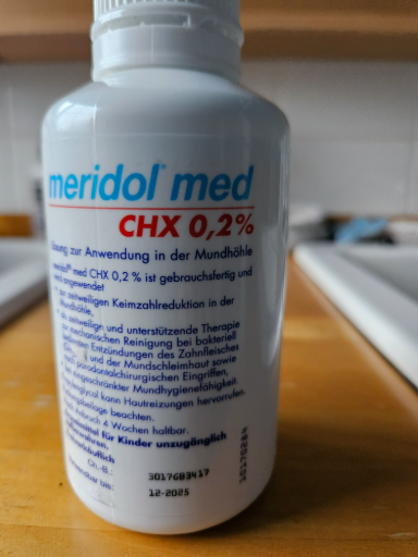 meridol med CHX 0,2% is an oral mouth rinse designed for use in the mouth, particularly for reducing bacterial load and maintaining oral hygiene. Originally developed by GABA International AG in Switzerland, this product specializes in oral care and is part of the broader meridol brand portfolio known for its effective solutions for oral health. Currently, the brand is owned by Colgate-Palmolive Company, headquartered in the United States, which is known for its extensive range of consumer health and hygiene products. The product is manufactured in multiple countries to ensure global availability and quality standards.